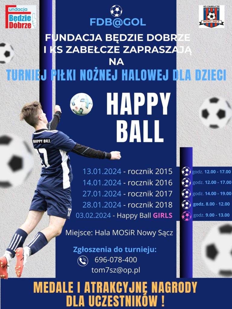 Hallo hallooo z przyjemnością informujemy, że zbliża się wielkimi krokami kolejna edycja naszego cyklu Happy Ball – to turnieje piłki nożnej halowej dla dzieci które KS Zabełcze Akademia Piłkarska GOL organizuje wraz z Fundacją Będzie Dobrze